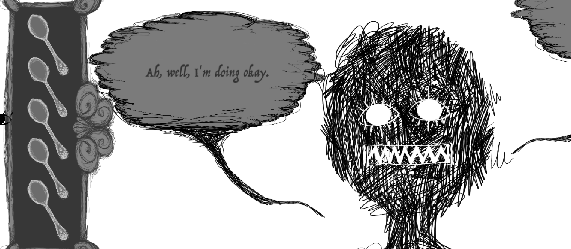 Move the mouse to balance looking at your speaking partner's eyes (which loses spoons but keeps your partner happy), with looking at their face or away (which regains spoons but might make your partner upset if you look away too long).